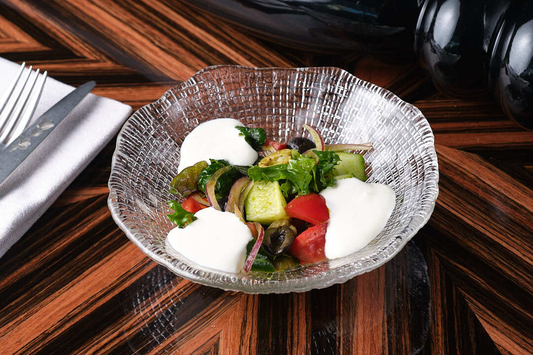 Блюда подаются с томатами, огурцами, ароматной зеленью, лавашом и домашней аджиков