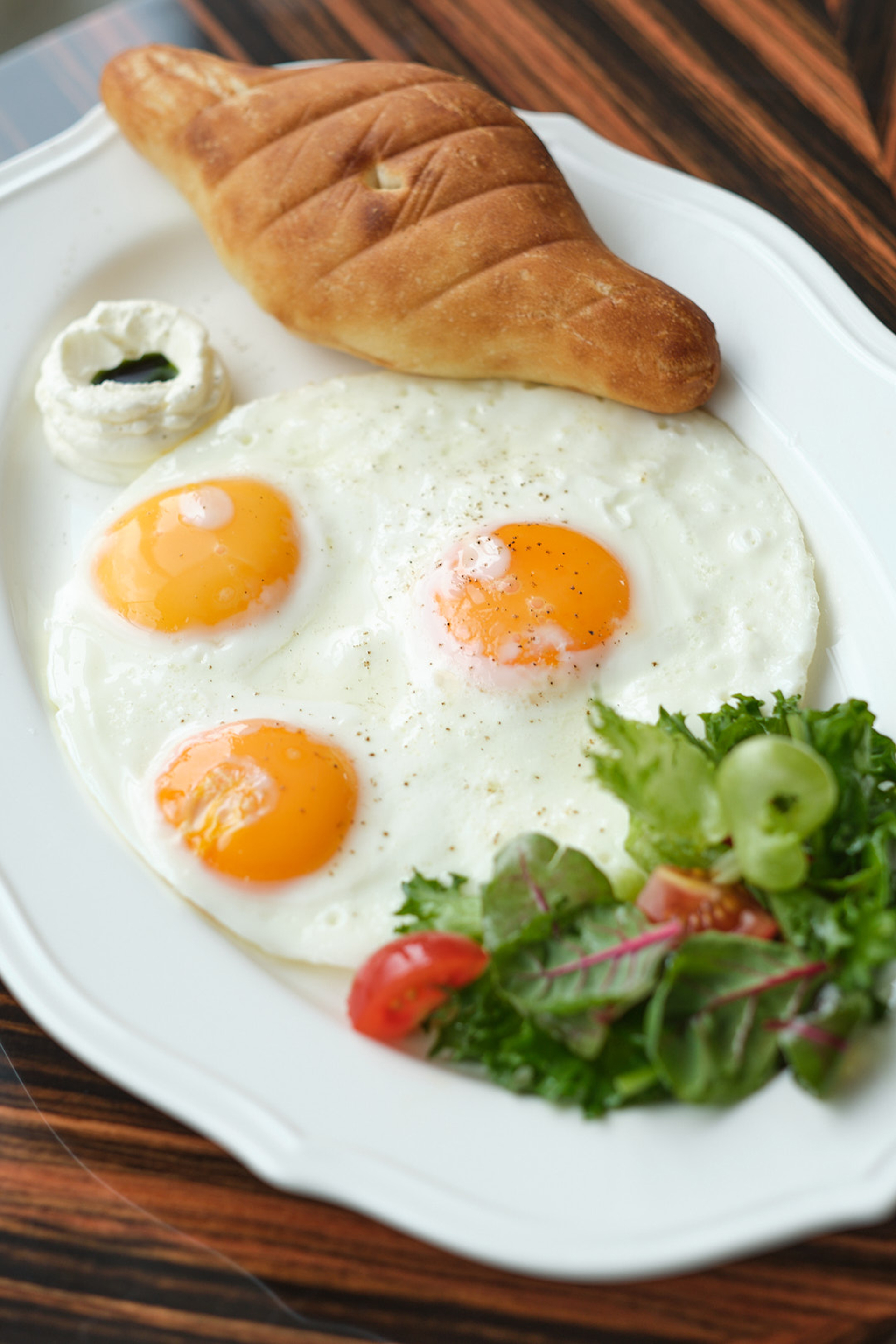 Глазунья, скрэмбл, или омлет. Из трех яиц, листья салата, черри, кремчиз