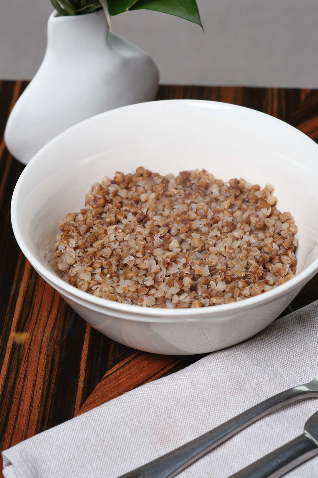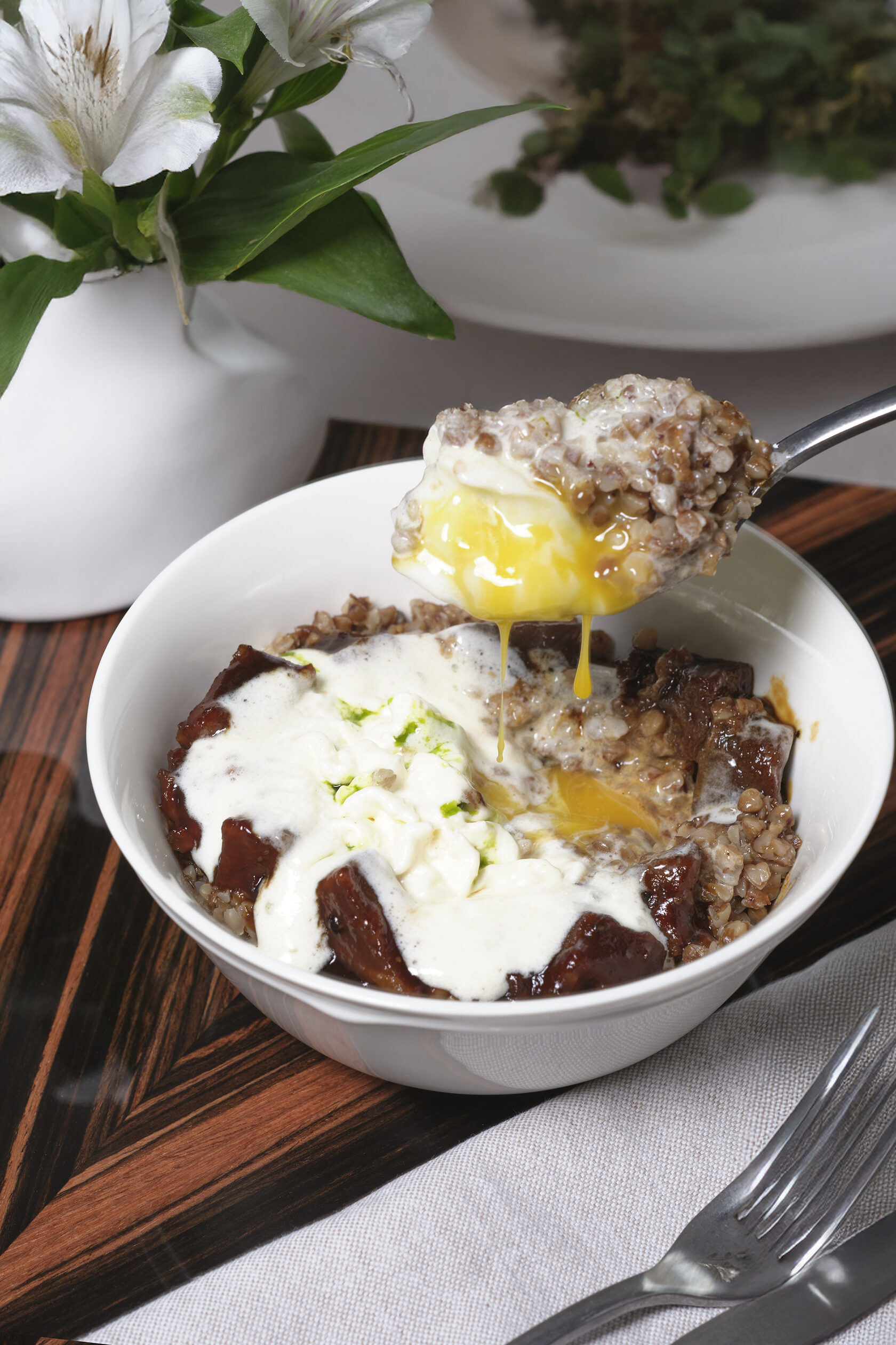 Гречневая каша, телячьи щёчки, яйцо пашот, мусс пармезан