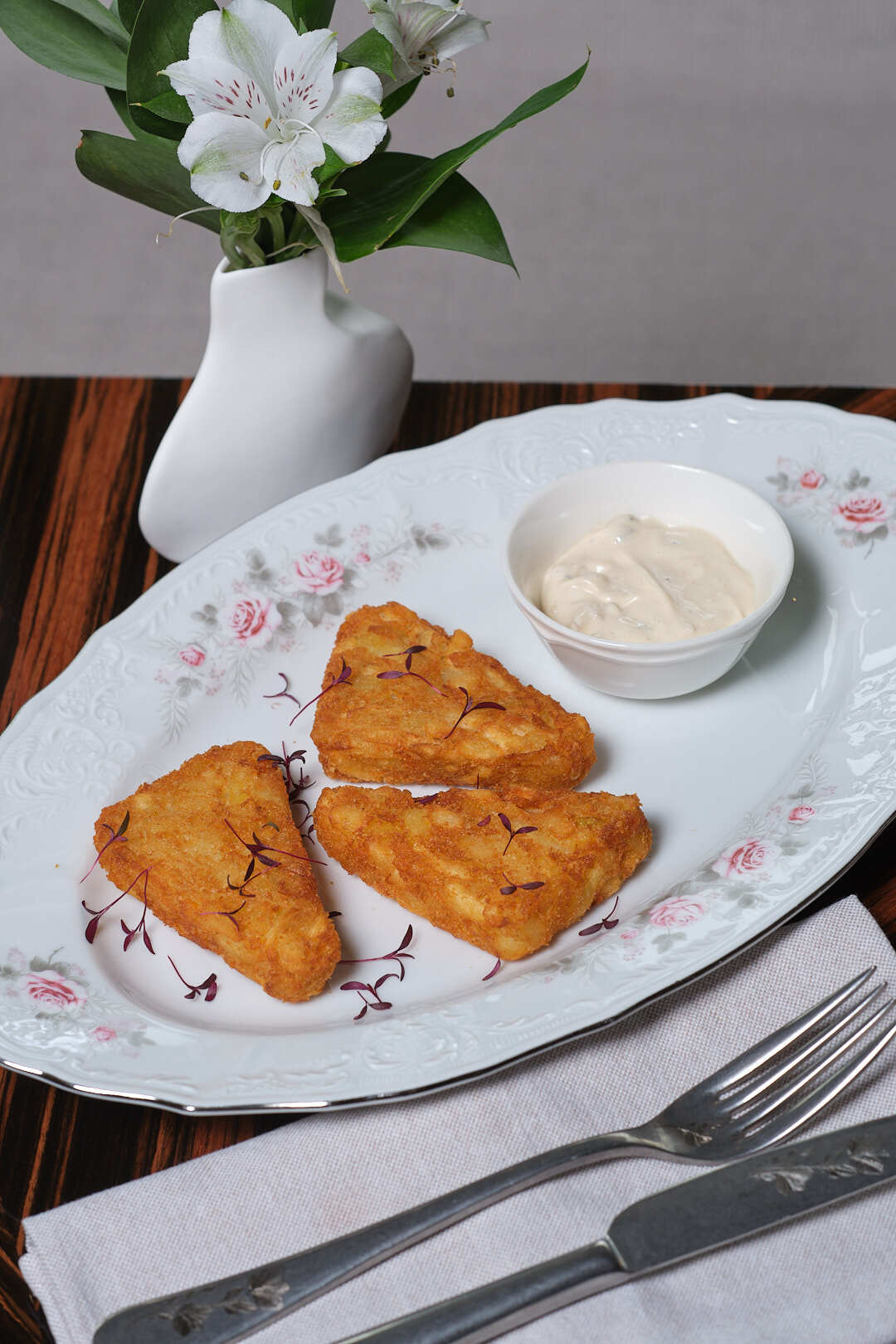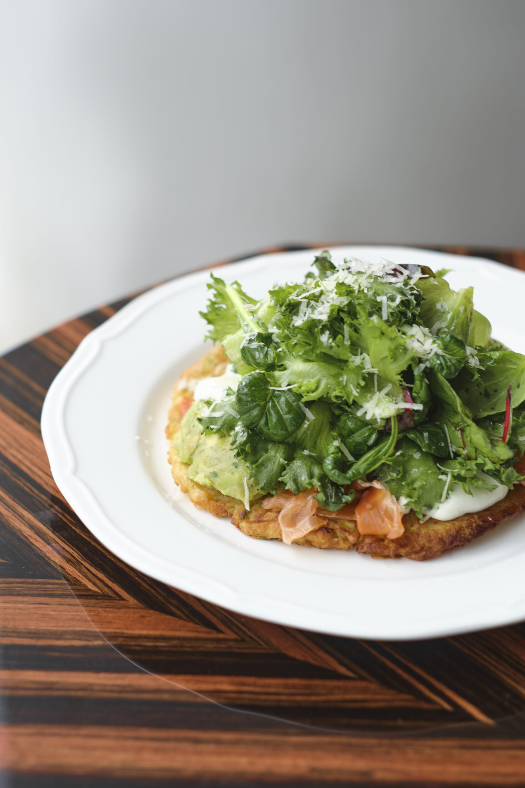 Драник из цукини, яйцо пашот, гуакамоле, форель слабой соли, сырный крем, хрустящие листья салата
