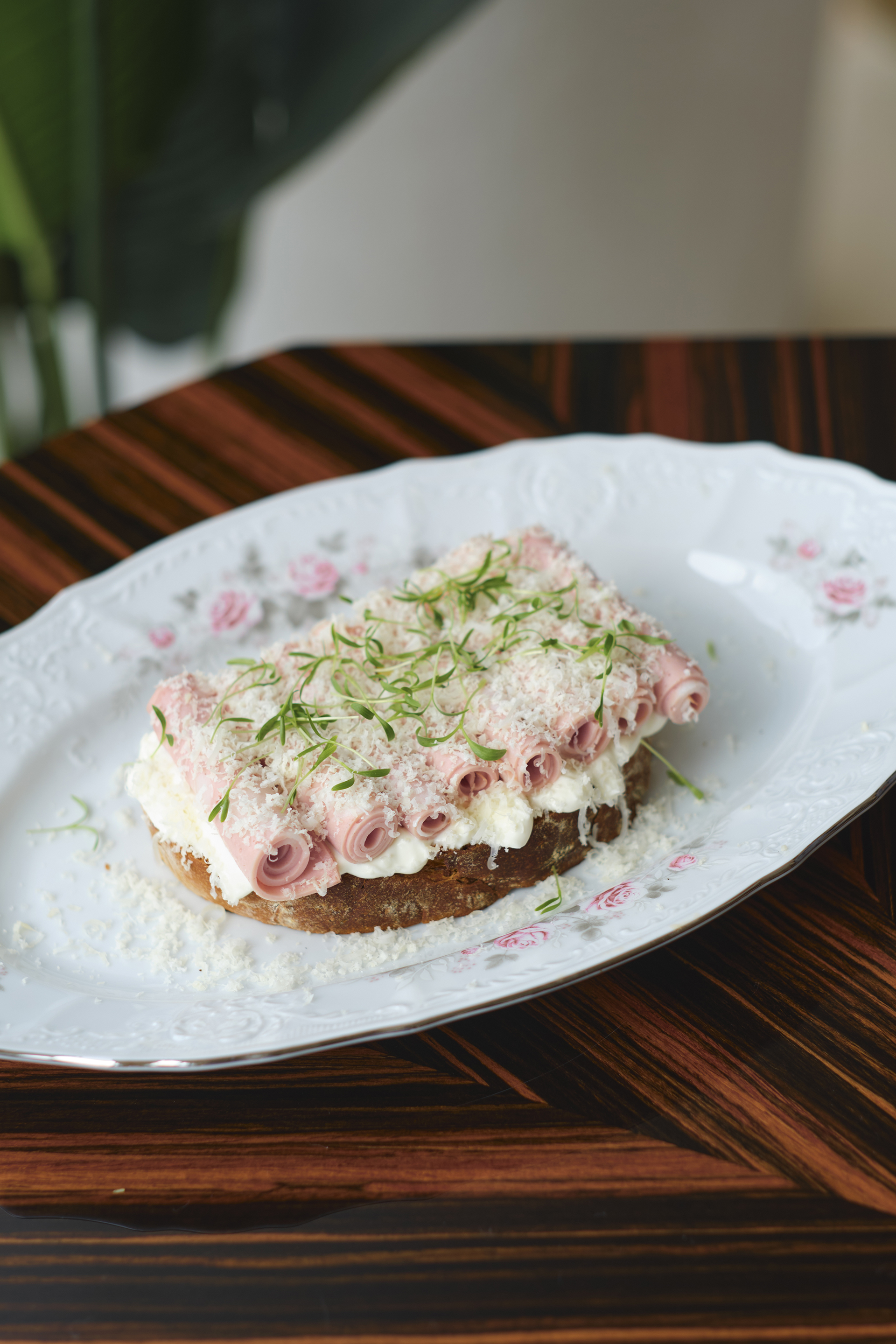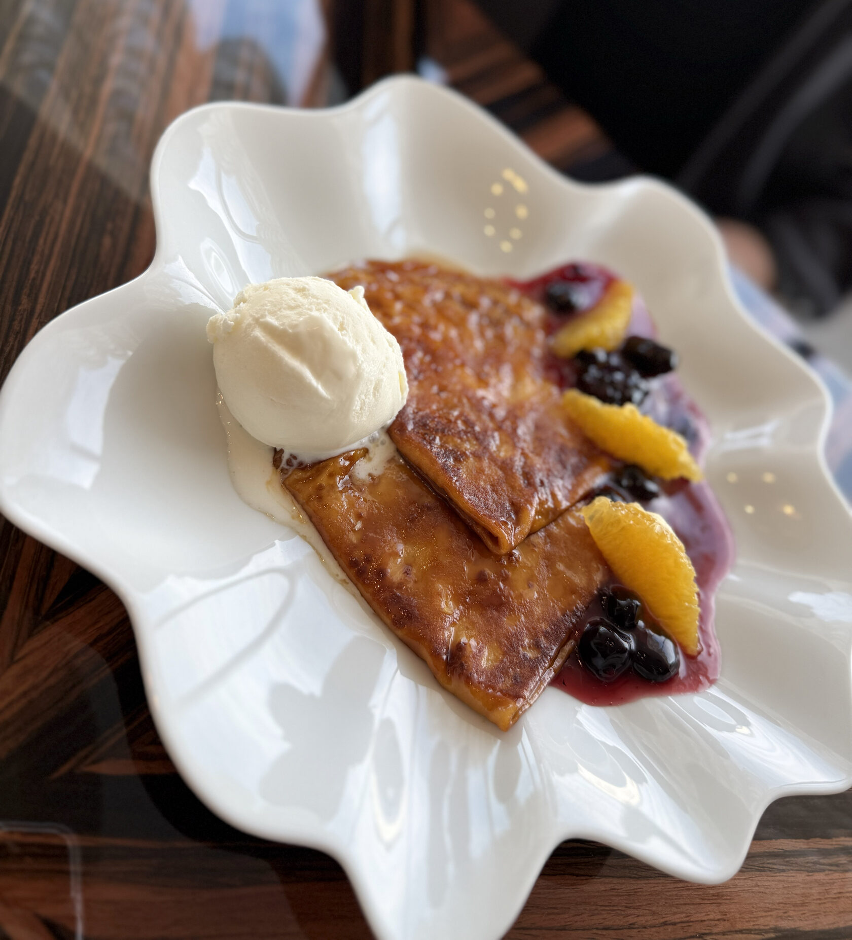 Большая вафля, морская форель слабой соли, яйца пашот, мусс пармезан