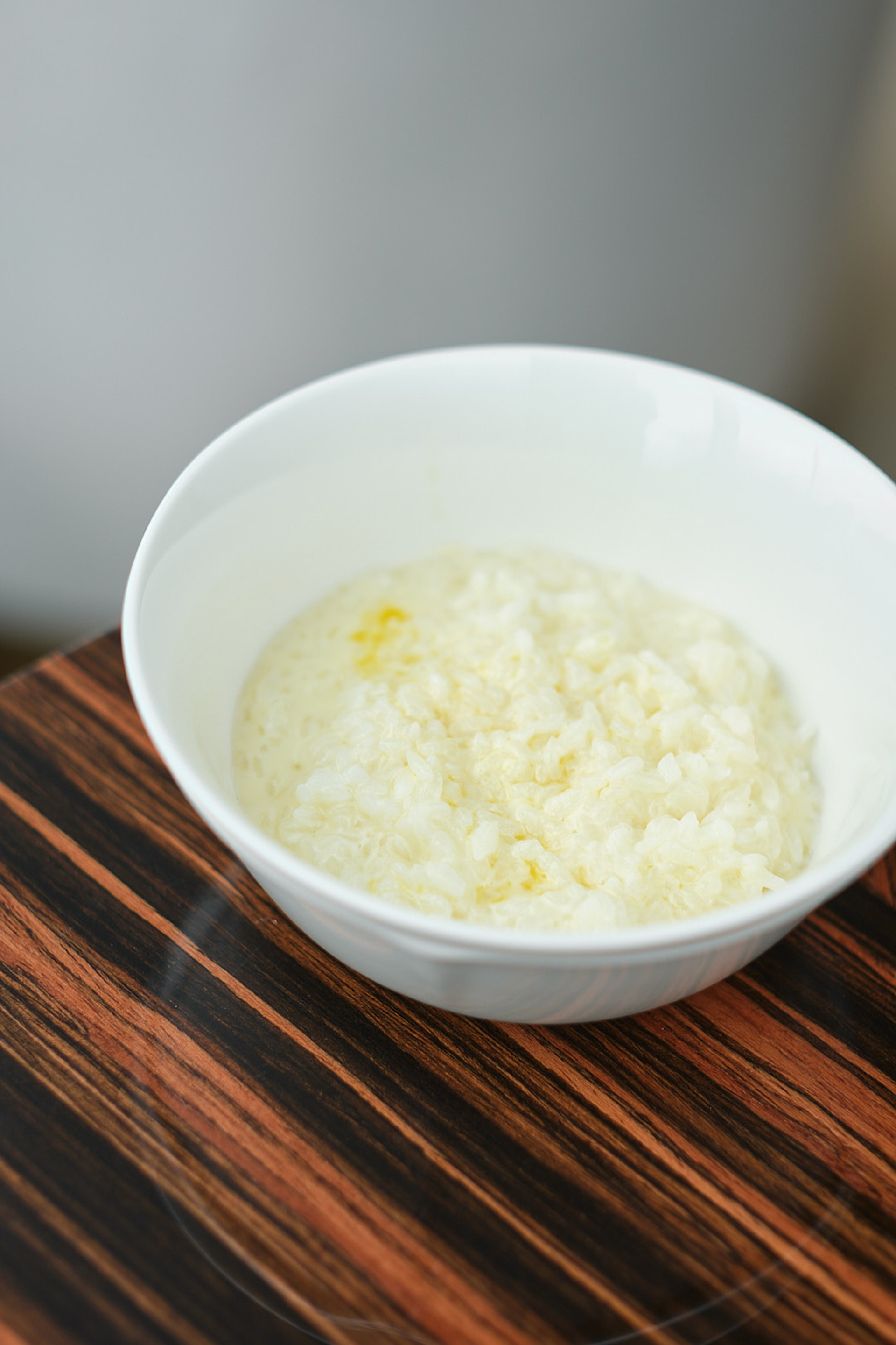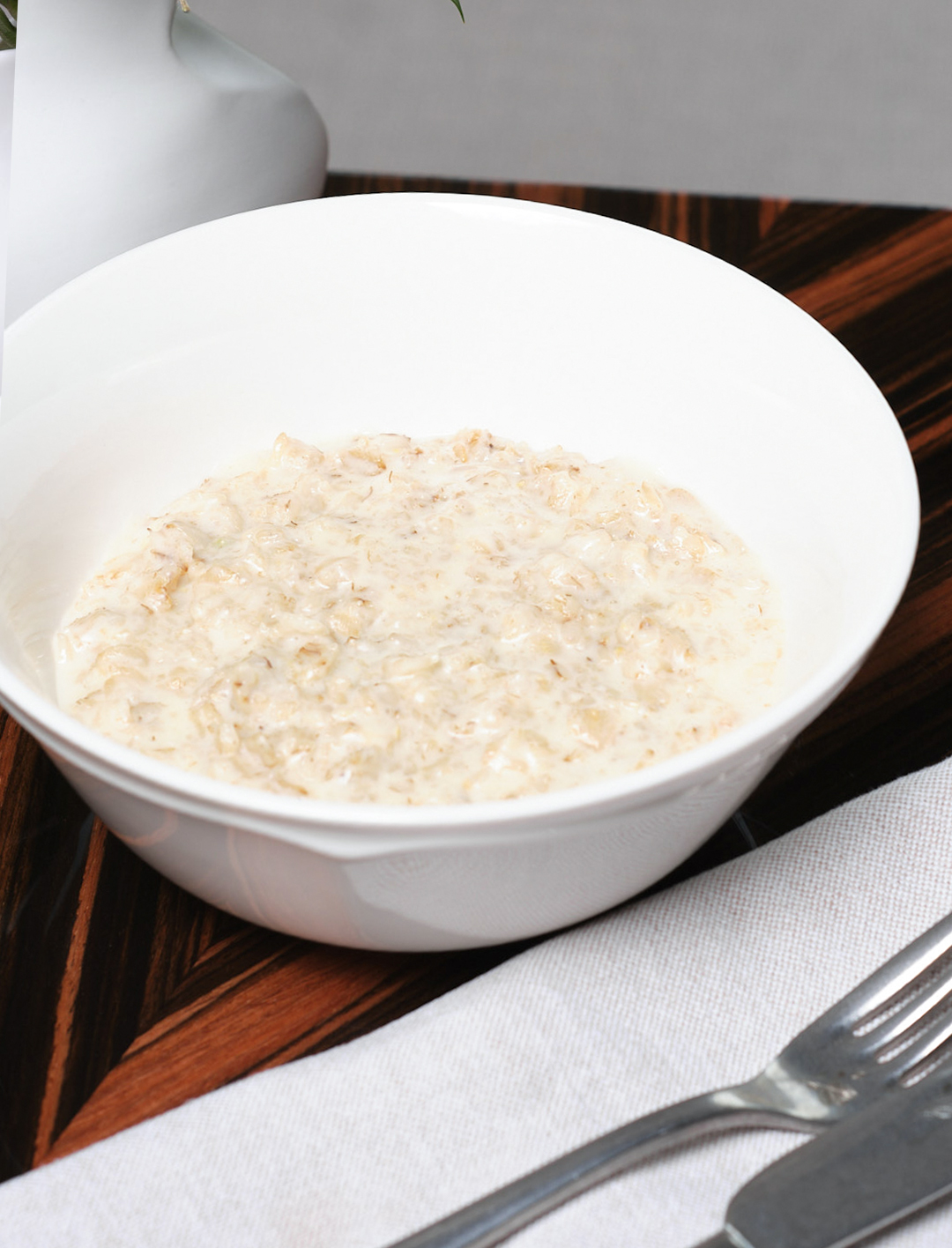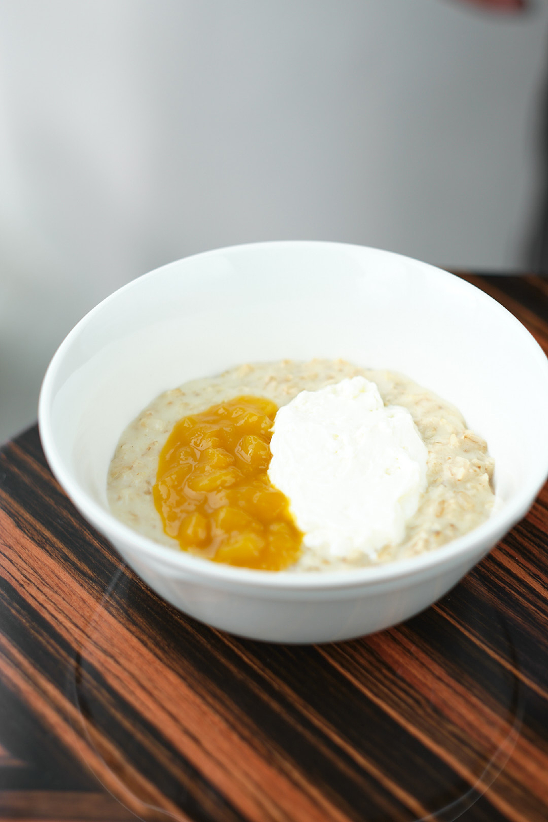 Овсяная каша, мусс из сливочного сыра, соус манго-юдзу