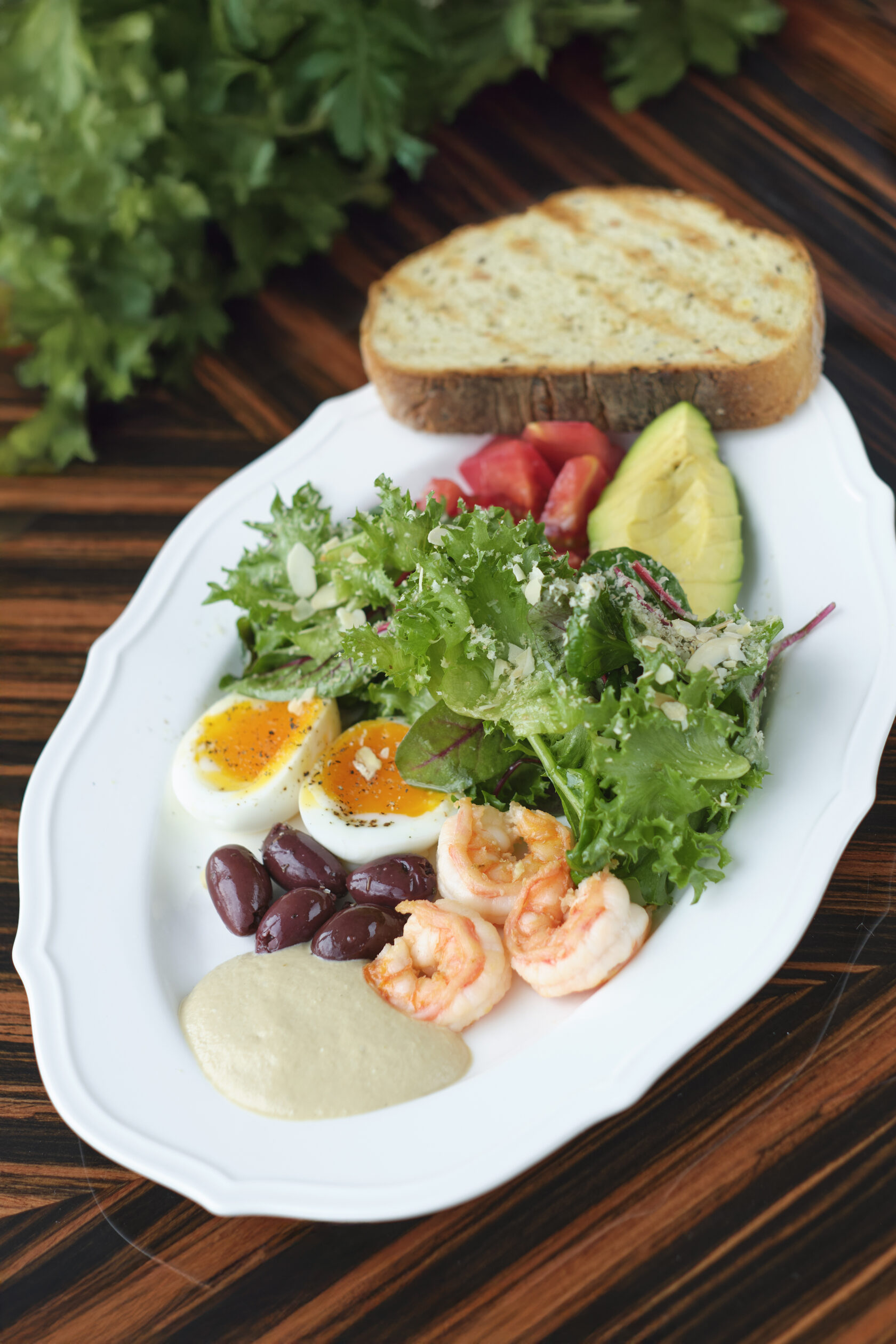 Тигровые креветки, яйцо всмятку, оливки каламата, помидоры, авокадо, листья салата, мусс вителло тонато, зерновой хлеб