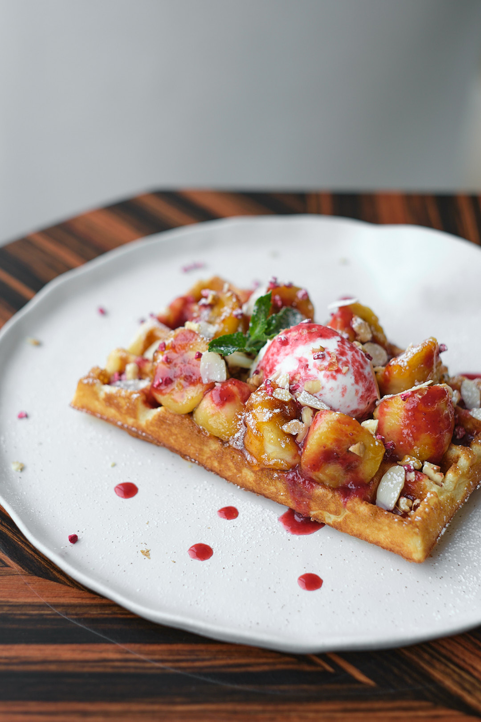 Большая вафля, карамелизированный банан, пломбир ягодный соус, лепестки миндаля