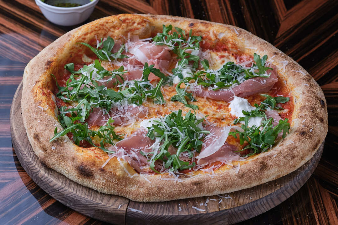 Пицца с прошутто, руккол, страчателла