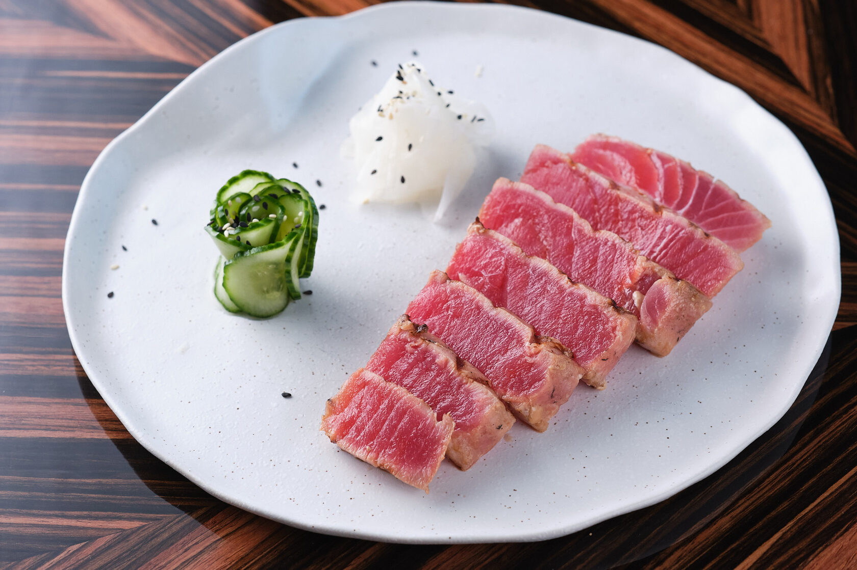 Стейк тунца с маринованным дайконом и огурчиками кимчи