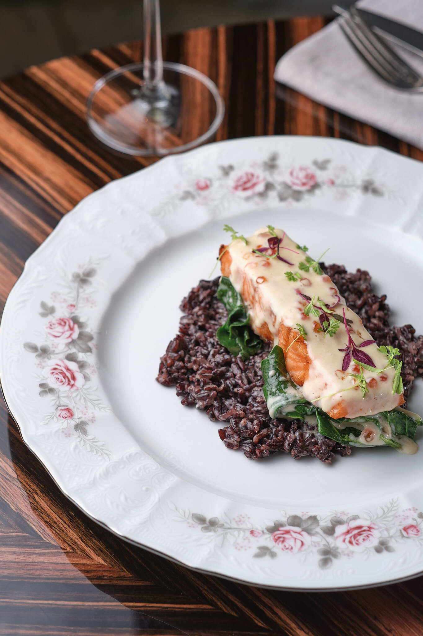Форель с черным рисом и соусом шампань и красной икрой